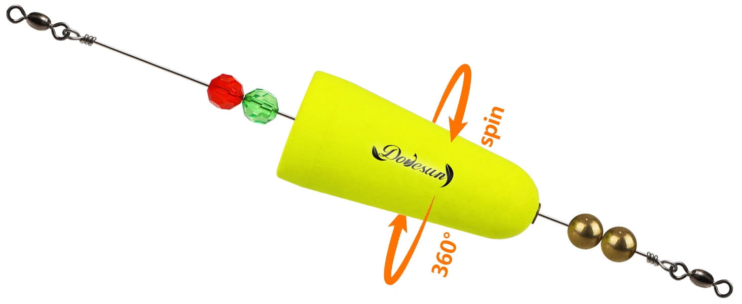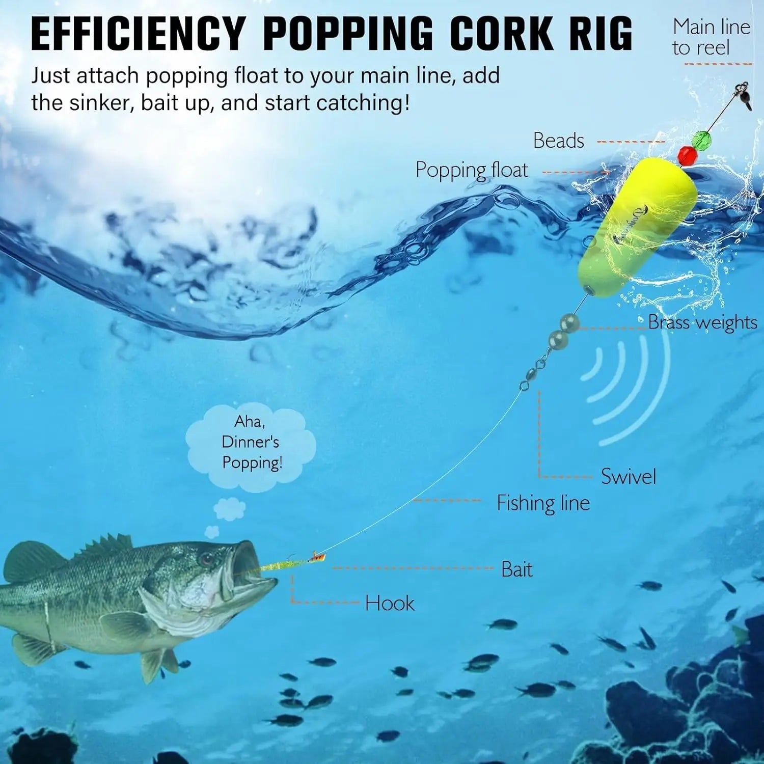 EASY TO USE AND EFFICIENCY POPPING CORK:Just attach popping cork to your main line, add the sinker, bait up, and start catching! Easy to add onto your line and you can change out the leaders in no time at all. With two swivels at the top and bottom of the bobbers rig, popping corks for saltwater can rotate 360°freely in the water and it won't be tangled easily. Works well with both real and articulate baits-shrimp. Float shape and brass beads really makes this cork sing, it will call in fish!