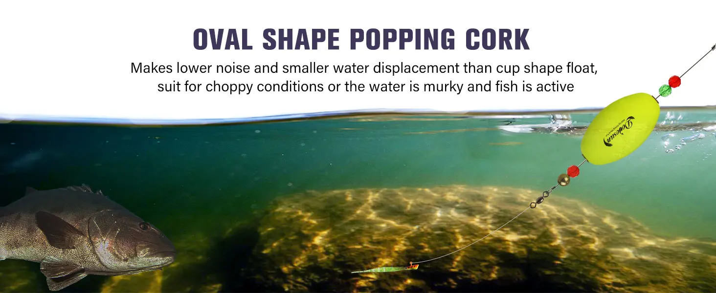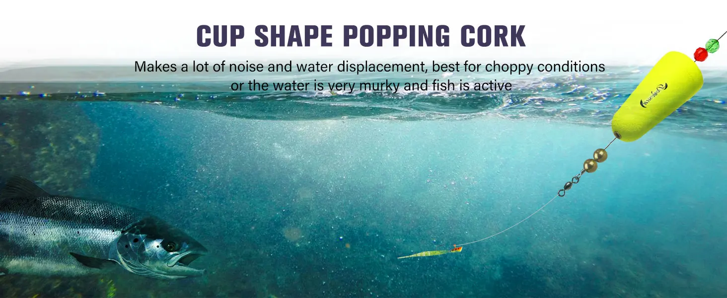 3 SHAPES SOUND-PRODUCING POPPING CORK FOR VARIOUS CONTITIONS: The cup shape popping cork hit the water surface to create a splash, which create great splashing noise and action when popped, best for choppy conditions or the water is very murky and fish is active. The oval shape make lower noise than cup shape float, suit for choppy conditions or the water is murky and fish is active. The cigar shape makes little sound, suit for very calm or clear water and fish is not active.