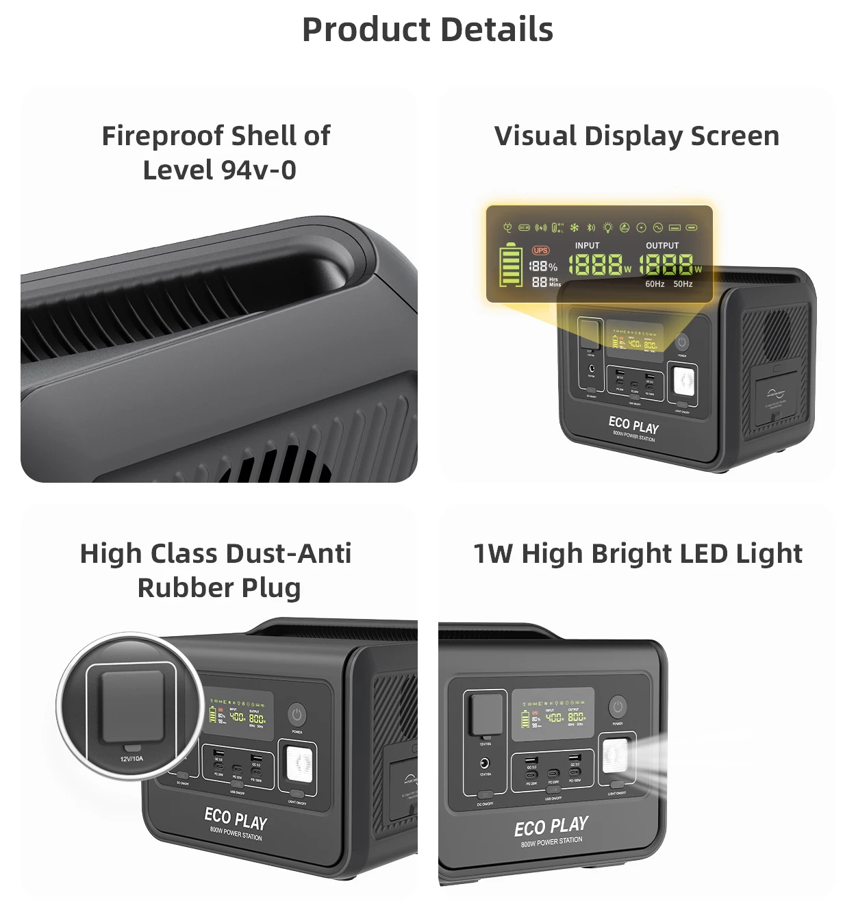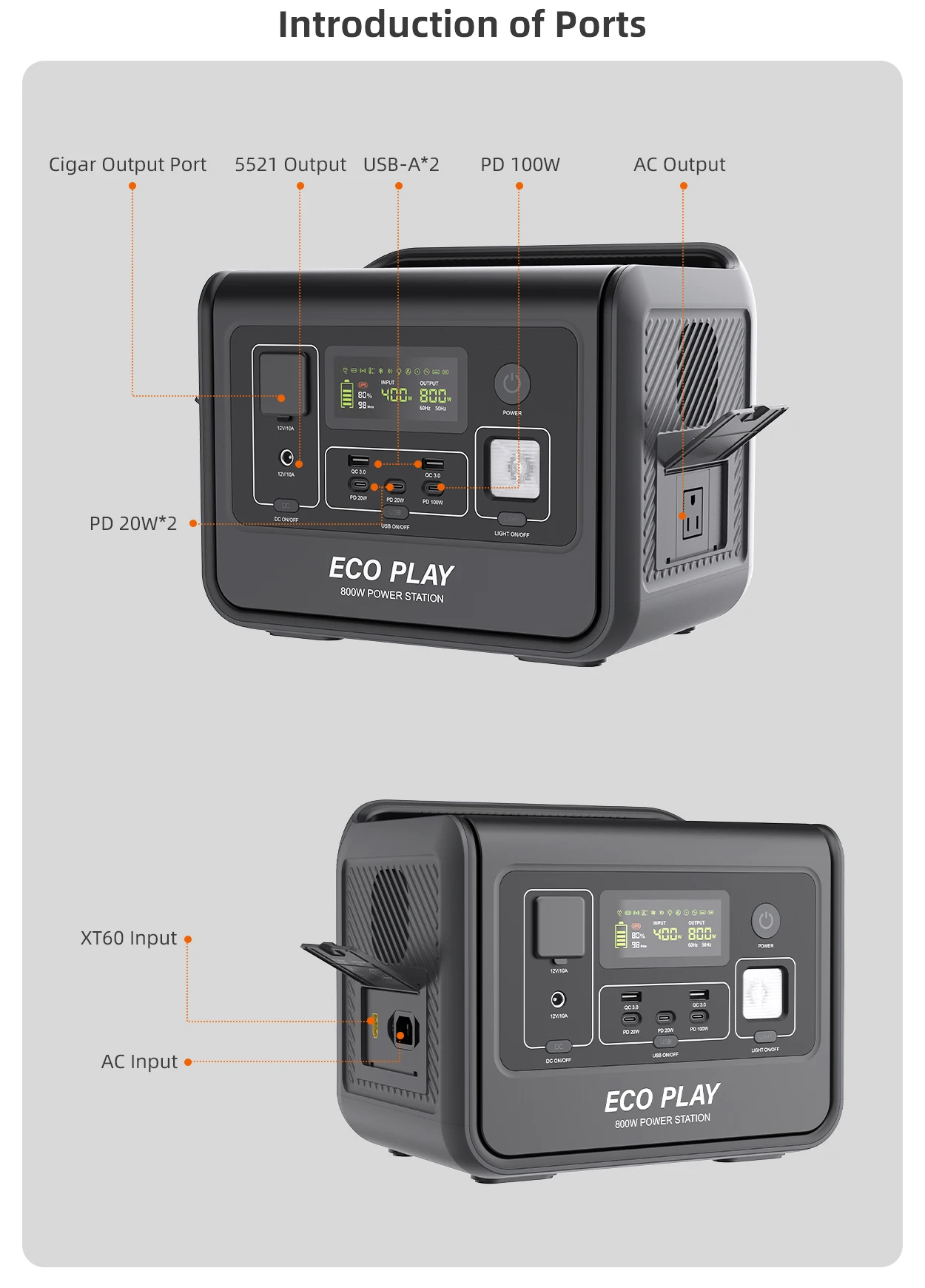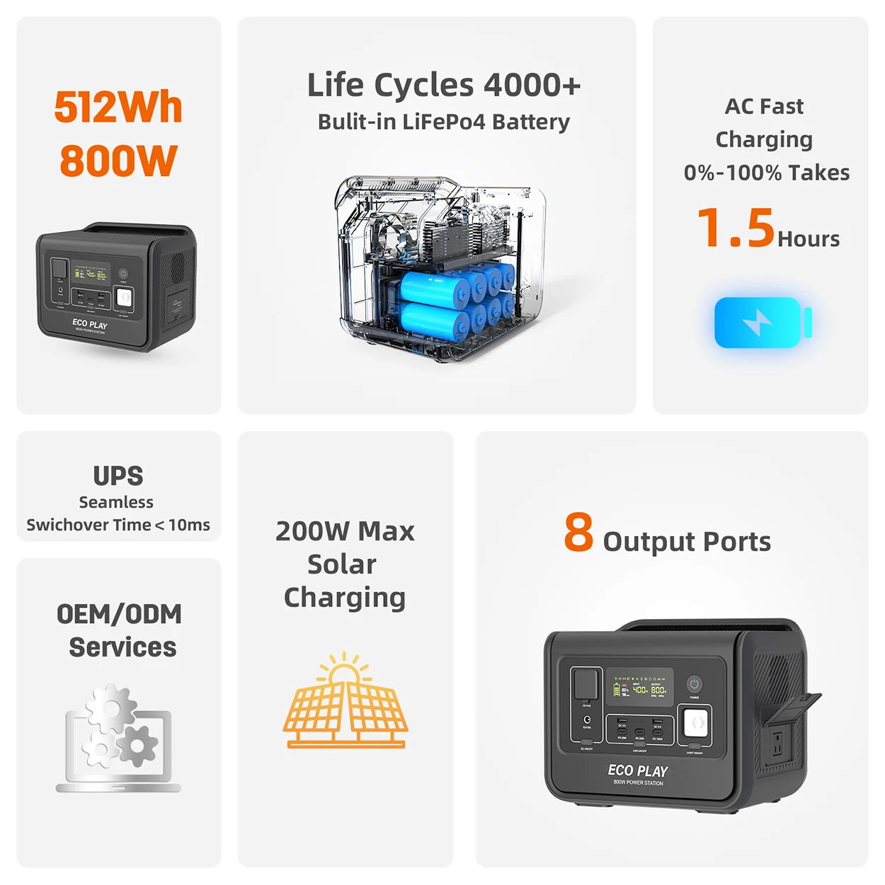 Eco Play Portable Power Supply, EP800 512Wh, LiFeP04 Battery with 800W (1600W Surge) AC Outlets for Outdoor Camping RV Home